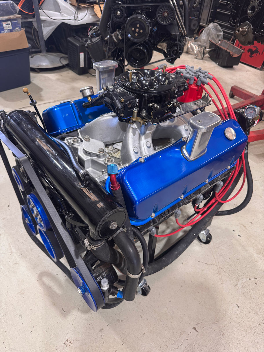 Componets include, Mercury aluminum heads,stainless steel valvues, roller cam lifters, roller rockers, Manly crank and rods, forged pistons (10.5:1 Compresion Ratio) Dart intake manifold, a billet 1050 custom carburator,custom valve covers, powder-coatedpulleys an MSD distribuator, coil and wires, with marine wiring harness with electrical box.